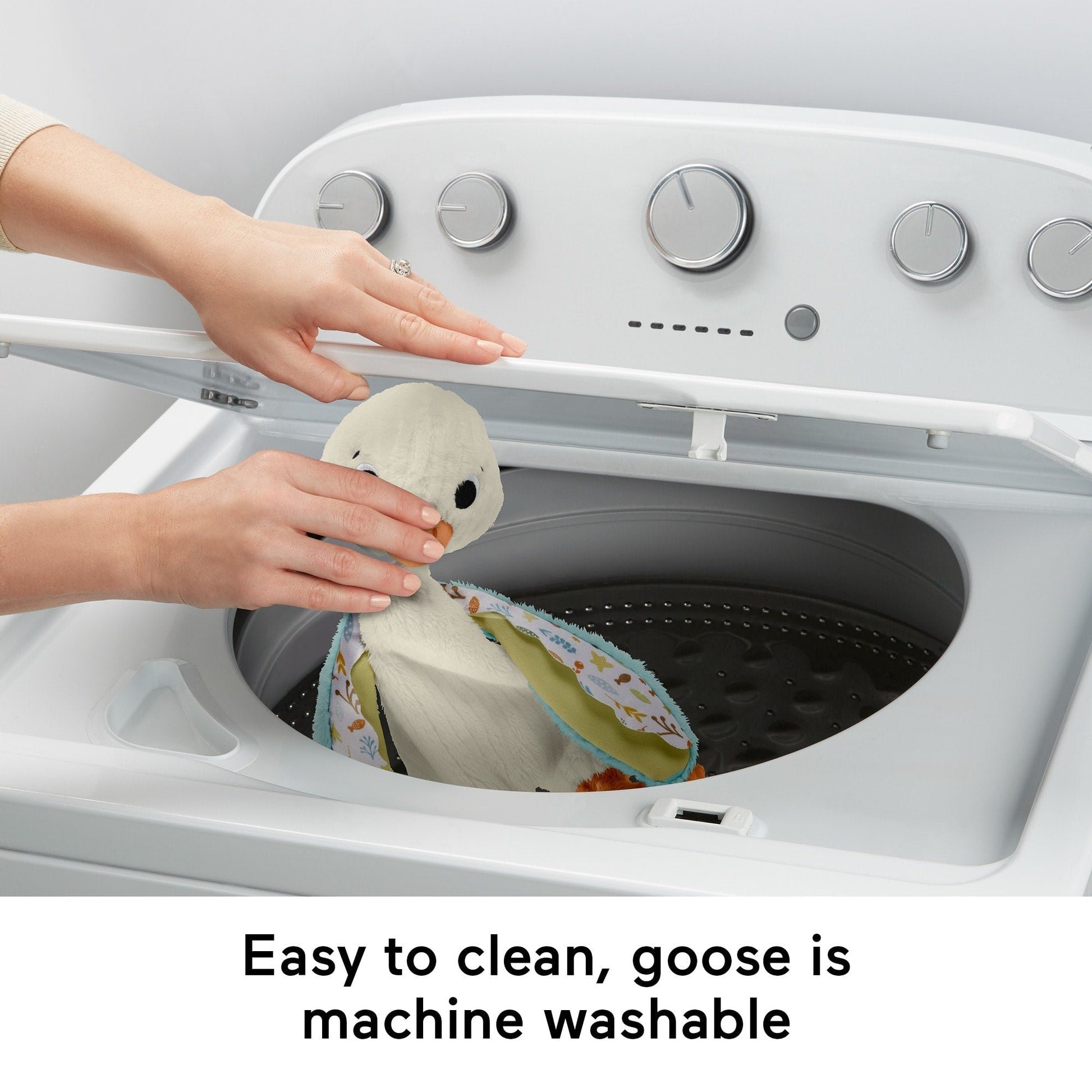 Your little one will be silly with love for the Snuggle Up Goose baby sensory toy from Fisher-Price. With every squeeze and hug, this snuggly plush toy can help provide comfort and a sense of security for your baby both home and away. To help foster your newborn’s developing senses, this plush goose also has multi-textured fabric wings for little fingers to explore, and when baby shakes, they’ll hear a soft jingle sound. Colors and decorations may vary.