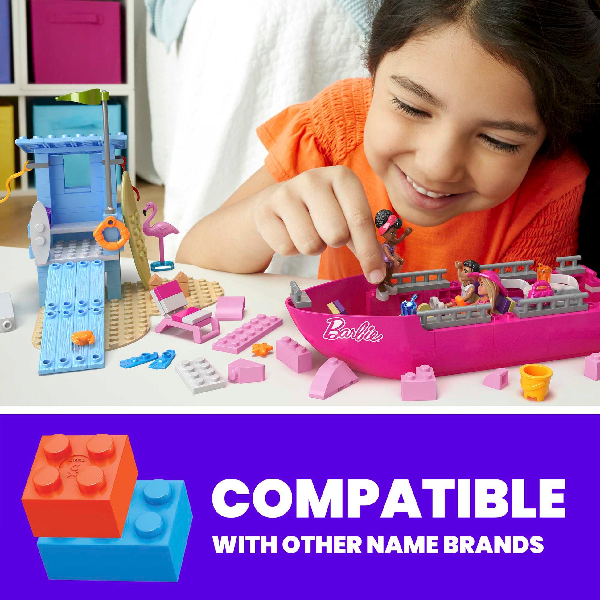 Kids can join Barbie and her friends for a beach splash adventure when they build the Malibu Dream Boat. This buildable Dream Boat features lounge chairs, TV, seating area, slide and sundeck. The top of the boat can be easily removed to access the main deck for interior play. Kids can also build the Malibu lifeguard tower with an outdoor shower and paddle board to ride the wave.
