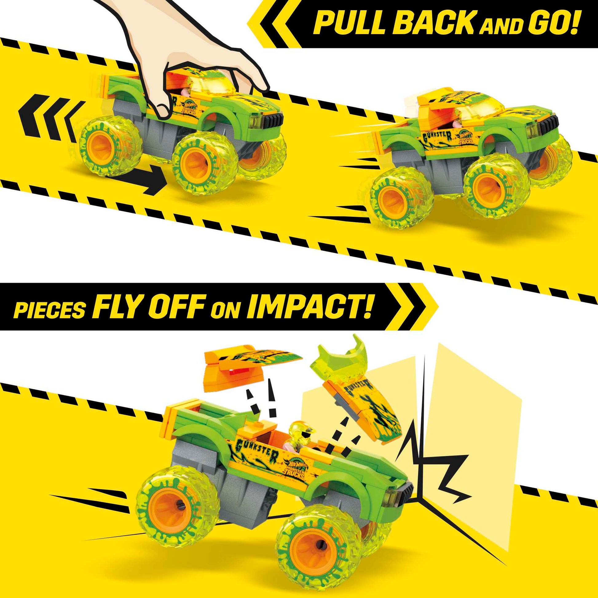 Get ready for epic Smash & Crash action that kids will love with the Gunkster monster truck building toy. Kids can build, race, crash and smash by pulling the vehicle back and letting it go to watch the pieces fly off on impact. The included buildable micro action figure driver fits in the driver's seat.