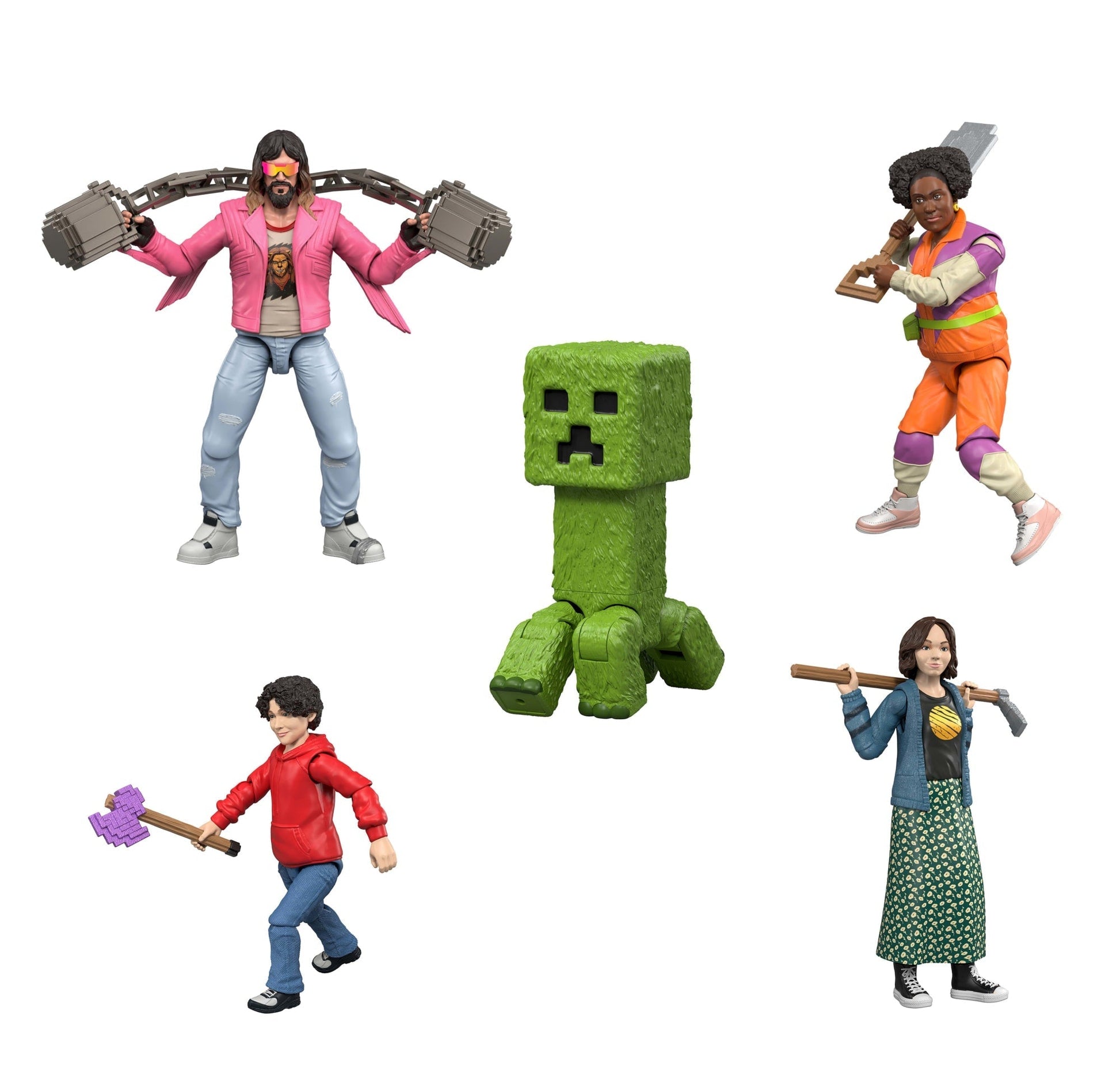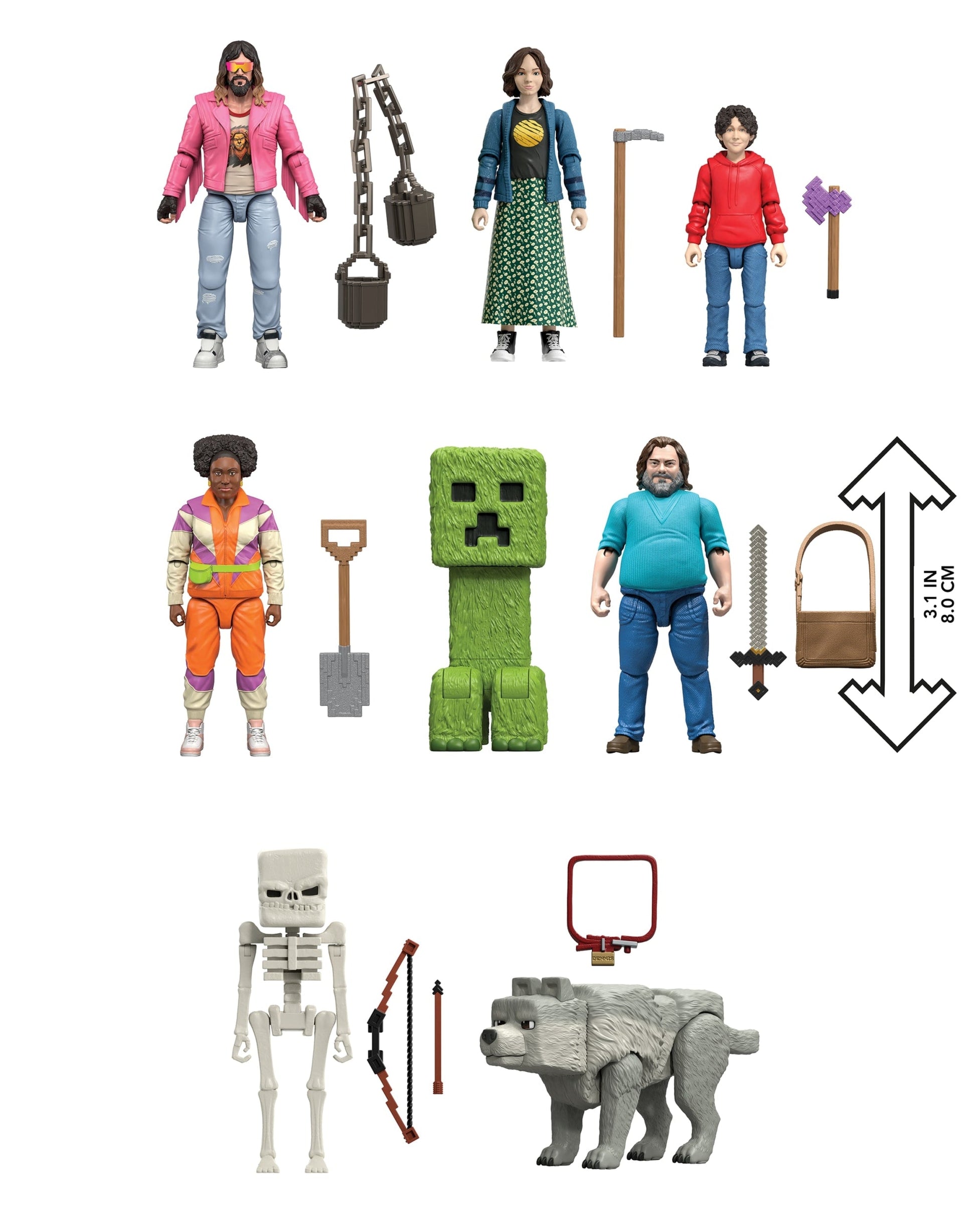 Step through the portal and into the adventurous world of A Minecraft Movie with the Ultimate Movie Pack. This epic set is an instant collection with eight action figures, each with an accessory! All five of the film's stars are present -- Steve, Garrett, Natalie, Henry and Dawn -- as well as Dennis the wolf, a hostile Skeleton and a glow-in-the-dark Creeper. The characters are designed in 4-inch scale with authentic details and posability. Recreate favorite movie scenes or invent new ones! The collectible set makes a fun, video-game themed gift for fans of the movie and Minecraft lovers ages 6 years old and up! Colors and decorations may vary.